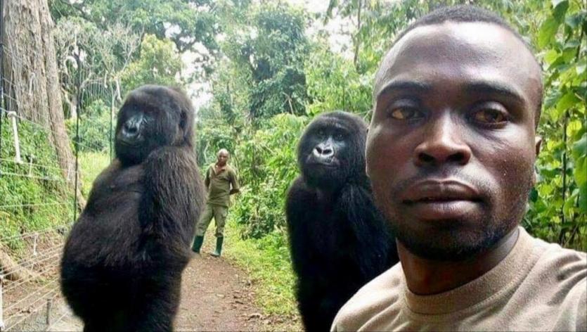انتشرت على وسائل التواصل الاجتماعي صورة ذاتية (سيلفي) لاثنتين من الغوريلا الجبلية مع حارسهما في جمهورية الكونغو الديمقراطية.