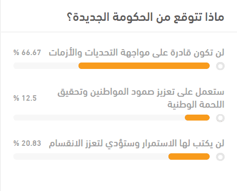 ووفقاً للاستطلاع الذي تواصل على مدار أسبوعين، فإن 66.67 % من المشاركين رأوا أن الحكومة لن تتمكن من مواجهة التحديات الحالية التي تعصف بالحالة الفلسطينية، ورأى 12.5% فقط منهم أنها ستتمكن من تعزيز صمود المواطنين وتحقيق اللحمة الوطنية، فيما رأى 20.83 % من المشاركين بأن هذه الحكومة لن يكتب لها الاستمرار وستعزز الانقسام في الحالة الفلسطينية.