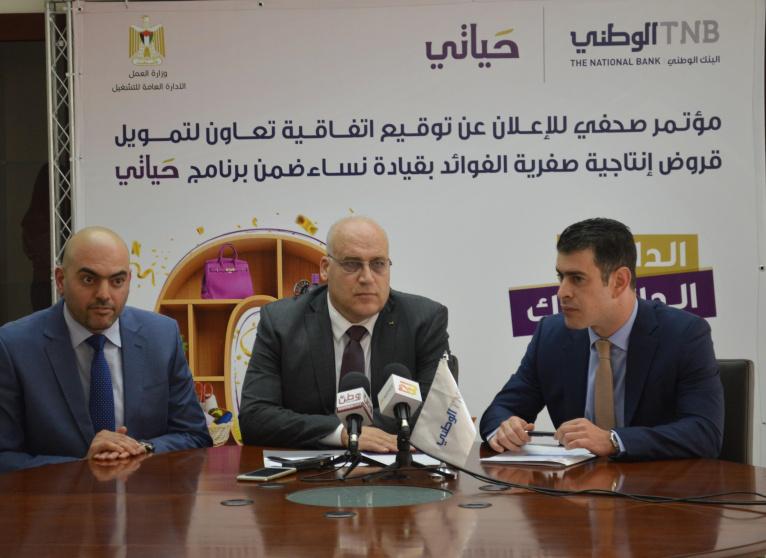 ووقع الاتفاقية وزير العمل د. نصري أبو جيش ومدير عام البنك الوطني أحمد الحاج حسن بحضور مدير عام التشغيل رامي المهداوي وعدد من المدراء من الطرفين ولفيف من الصحفيين، وذلك في مبنى الإدارة العامة للبنك الوطني في مدينة رام الله.