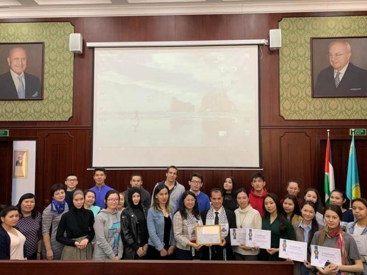 كازخستان - نور سلطان- إستمراراً لفعاليات سفارة دولة فلسطين في كازاخستان لإحياء الذكرى السنوية الـ 71 لنكبة الشعب الفلسطيني ، ألقى سفير دولة فلسطين لدى جمهورية كازاخستان د. منتصر أبو زيد صباح اليوم الأربعاء، محاضرة أمام طلاب وطالبات القانون الدولي والهيئة التدريسية في الجامعة الوطنية الكازاخستانية للقانون والعلوم الإنسانية في قاعة المرحومين "سعيد خوري" و "حسيب صباغ" عن النكبة الفلسطينية، حيث أسهب السفير أبو زيد بحيثيات يوم النكبة بالتفاصيل ومدى تمسك الفلسطينيون بأرضهم ووطنهم، كما تطرق الى تاريخ الصراع العربي – الإسرائيلي وعملية السلام المتعثرة في الشرق الأوسط نتيجة التعنت الإسرائيلي المعرقل لعملية السلام ، وإستمرارها بسياسة الإستيطان، وإنتهاكها اليومي لحقوق الإنسان الفلسطيني، كما أشاد بالمواقف الإيجابية والمبدئية الثابته لحكومة كازاخستان تجاه تحقيق الحقوق المشروعة للشعب الفلسطيني، كما أشاد بتطوير العلاقات الفلسطينية - الكازاخستانية.