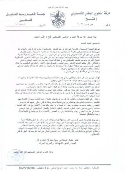 وأكدت حركة فتح في بيان وصل راية نسخة منه بأن "الفئة العميلة التي إجتمعت مع المستوطنين لا تمثل إلا نفسها ووحدهم سيتحملون عواقب ما اقترفوه".