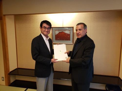 سلم مبعوث الرئيس محمود عباس، نائب رئيس الوزراء، وزير الاعلام نبيل أبو ردينة، رسالة من رئيس دولة فلسطين محمود عباس، إلى رئيس الوزراء الياباني شينزو ابى، حول تطورات القضية الفلسطينية والخطوات التي تنوي القيادة اتخاذها لمواجهة ما يسمى بـ"صفقة القرن" حال الاعلان عنها.
