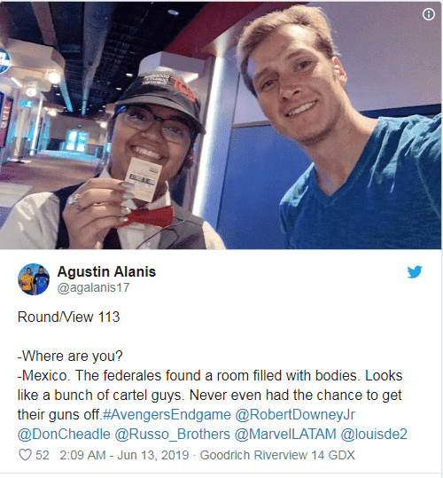 وكتب أغوستان ألانيس على "تويتر": "أعمل 10 ساعات وأشاهد الفيلم مرتين في اليوم خلال أيام الأسبوع لمدة ست ساعات على الأقل"، مرفقاً المنشور بصورة له في دار للسينما حاملا البطاقة رقم 110 لمشاهدة الفيلم. وقد ألحقها بتغريدات أخرى تثبت أنه شاهد هذا الفيلم 3 مرات أخرى، مما يجعل رقم المشاهدات حتى الآن 113.