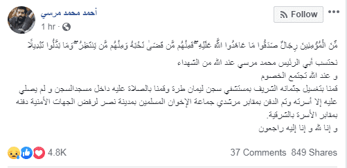 وأضاف أحمد مرسي أن الدفن تم بحضور أسرته في ضاحية مدينة نصر "لرفض الجهات الأمنية دفنه بمقابر الأسرة في محافظة الشرقية".