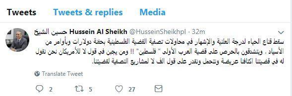 وأضاف الشيخ عبر "تويتر": "سقط قناع الحياء لدرجة العلنية والإشهار في محاولات تصفية القضية الفلسطينية بحفنة دولارات وبأوامر من الأسياد، ويتشدقون بالحرص على قضية العرب الأولى "فلسطين" !! ومن يجبن في قول لا للأمريكان نحن نقول له في قضيتنا اكتافنا عريضة ونتحمل ونقدر على قول الف لا لمشاريع التصفية لقضيتنا".
