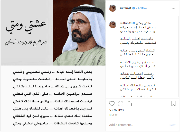 وأثارت قصيدة نشرها بن راشد يوم 22 يونيو/حزيران الماضي التكهنات بأنه كان يقصد بها زوجته هيا التي فرّت منه، وقال موقع The Daily Beast الأمريكي، إن حاكم دبي هجا زوجته في أبيات شعر نشرها على حسابه الرسمي في موقع إنستغرام.