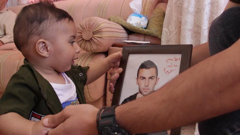 الطفل خالد، يشارك جدته وأمه الاعتصام في خيمة التضامن مع أبيه في دورا، وعادة يمسك صورة والده الأسير، مرّة يقبلها وأخرى يضربها، وكلا الحالتين تفرح وتبكي جدته، أو كما قالت " أول كلمة قالها خالد هي (بابا)، وهي أكثر كلمة عذبة ومعذبة".