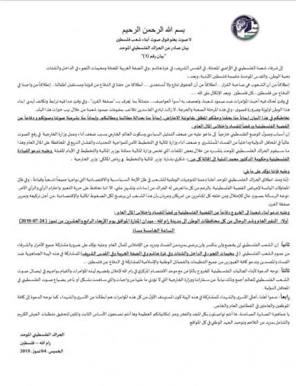 أولا: النفير العام وشد الرحال من كل محافظات الوطن الى مدينة رام الله - ميدان المنارة الموافق يوم الأربعاء الرابع والعشرين من تموز ( 24-07-2019) الساعة الخامسة مساءً