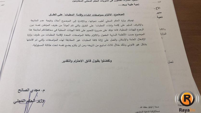 أصدر وزير الحكم المحلي مجدي الصالح تعميماً إلى مدراء الحكم المحلي في كافة المحافظات، دعاهم فيه للتعميم على الهيئات المحلية، لإزالة كافة المطبات غير المطابقة والتي أقيمت بشكل غير قانوني.