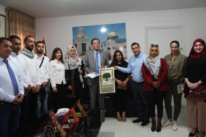 وافتتح الوفد رحلته بزيارة مكتب سعادة السفير الفلسطيني في تونس هايل الفاهوم الذي أثنى بشدة على هذه الزيارة وأهميتها، في إطار العلاقة المتميزة التي تجمع بين الشعب التونسي والفلسطيني، ودور كلا البلدين التاريخي في مواجهة الاحتلال الإسرائيلي عبر الأزمنة المتعاقبة، كما وأكد على دور الشباب الفلسطيني في تطوير استراتيجيات جديدة واعتماد ردات الفعل الممنهجة من اجل مواجهة عنجهية الاحتلال الصهيوني والنهوض بالواقع الفلسطيني، وأكد أن البوصلة التونسية والثابت الفلسطيني تشكلان المرجعية للعالم من جميع الجهات.