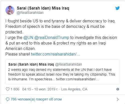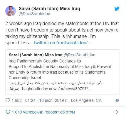 كشفت ملكة جمال العراق 2017 سارة عيدان أن حكومة بلادها تعمل على إسقاط الجنسية عنها بسبب دعمها للاحتلال الاسرائيلي، في مجلس حقوق الإنسان، ودعت المنظمة الأممية والولايات المتحدة وإسرائيل للتدخل.
