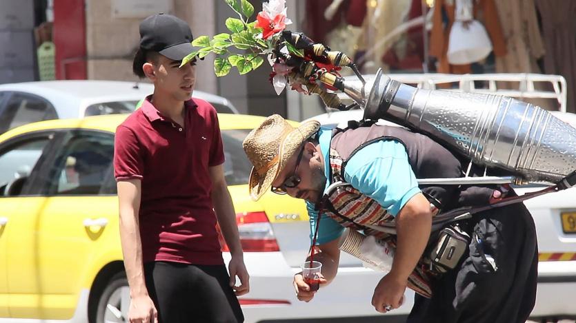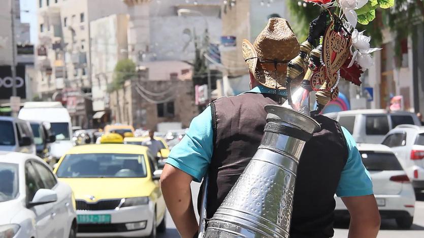 في الوقت الذي يهرب الجميع من "شمس تموز" التي لها سطوة خاصة حتى تجعل الماء تغلي في "الكوز" أو كما ورد في الأمثال الشعبية، ترى الثلاثيني راضي معبد يغزو أوساط دائرتها ويستوطن مركزية عمودها في شوارع الخليل حاملًا على ظهره دلّة شامية تزن حوالي 50 كيلو غرامًا، وينادي بلهجة خليلية أصيلة تتضمن المدود بألوانها وأنواعها " عصير بارد، تمر هندي بارد".