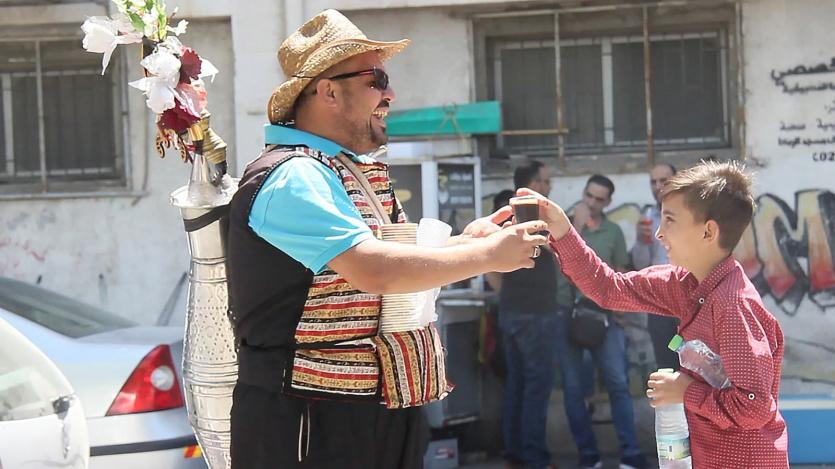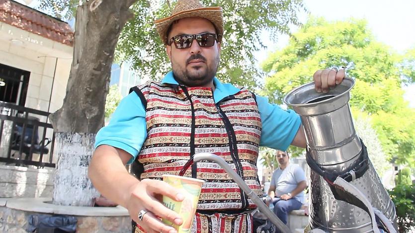 راضي شاب مثابر، يبيع التمر الهندي في الشوارع، واللوز والليمون والنعنع والتمر الطبيعي في المناسبات، لكنه يصارحنا " عصير الدلّة ليس طبيعيا بشكل كامل، نص نص".