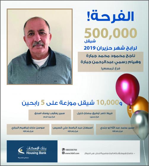 أعلن بنك الإسكان فروع فلسطين عن نتائج السحب على " الجائزة الكبرى النصف سنوية " لجوائز حسابات التوفير لشهر حزيران 2019 الحالي والتي تبلغ قيمتها 500,000 شيكل حيث ربحها " ناجح محمود محمد جبارة وهيام رسمي عبد الرحمن جبارة " وهم صاحبا حساب توفير مشترك لدى بنك الإسكان فروع فلسطين/ فرع ترمسعيا، بالإضافة الى 5 رابحين بجوائز ترضية قيمة كل منها 10,000 شيقل.