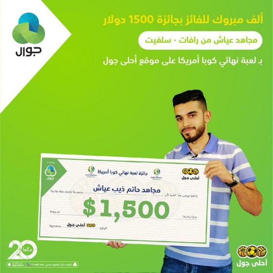 أعلن أمس موقع أحلى جول الرياضي عن الفائز بمسابقة نهائي كوبا أميركا ضمن مسابقات أحلى جول الرياضية ، والتي أطلقها الموقع برعاية حصرية من شركة الاتصالات الخلوية الفلسطينية – جوال،وكانت الجائزة من نصيب السيد "مجاهد حاتم عياش"الذي استطاع لوحده توقع نتائج لعبة نهائي كوبا أميركا بين البرازيل والبيرو بشكل صحيح وكامل.