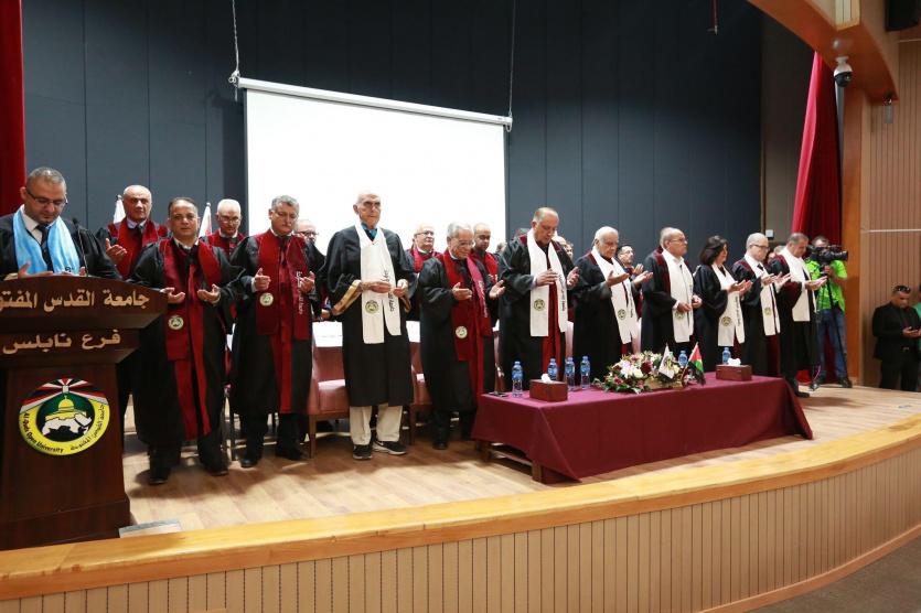 وسجل الشكر لشعبنا وللقيادة الفلسطينية لدعم الجامعة ومسيرتها، وصولاً إلى ما تحققه اليوم من تقدم في المجالات كافة، منوهاً إلى انتشار الجامعة في (18) فرعاً دراسياً في الضفة وغزة، بالإضافة إلى مركزين متنقلين بهدف ايصال العلم إلى كل بيت فلسطيني.