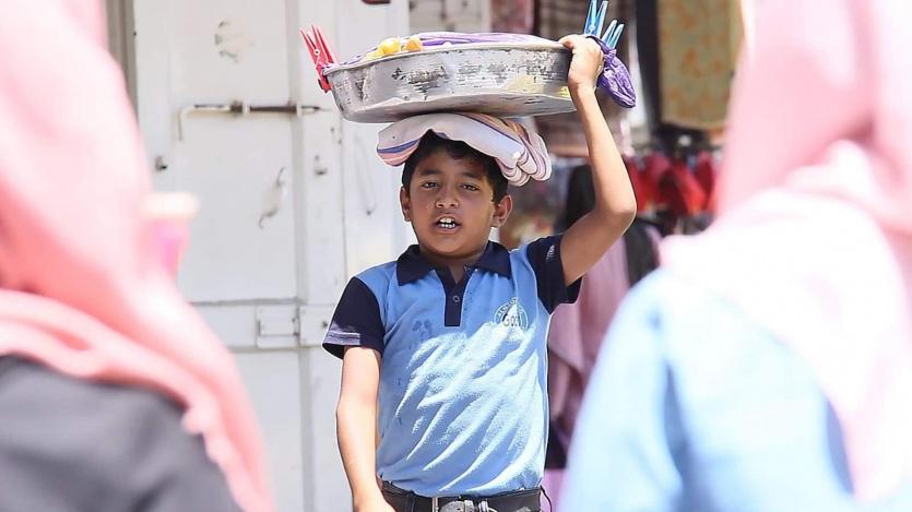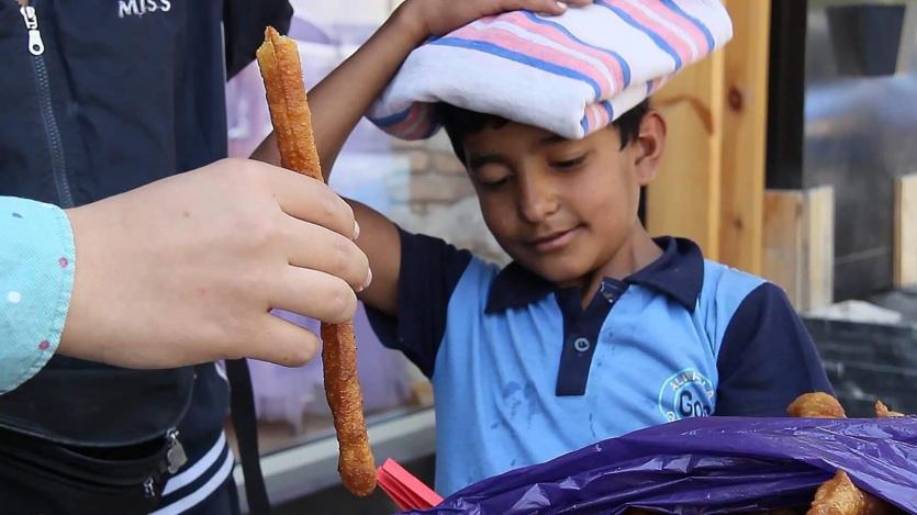 مؤيد، عمره 10 سنوات، يبيع الحلبي بدافع ذاتي، يتعب ويجتهد أكثر متحملًا حرّ الشمس، لإيمان ولد داخله رغم صغره "أعمل لأني أريد أن أسترزق، فأنا أحب العمل جدًا".