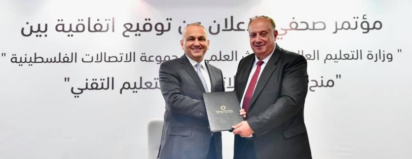 ووقع الاتفاقية وزير التعليم العالي والبحث العلمي أ.د. محمود أبو مويس، والرئيس التنفيذي لمجموعة الاتصالات الفلسطينية عمار العكر، سيتم بموجبها توزيع منح مجموعة الاتصالات على طلبة الانجاز في المجال التقني، بما ينسجم مع احتياج سوق العمل.