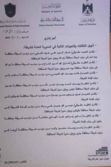 تنقلات وتعيينات في قيادة الشرطة بمحافظات الضفة