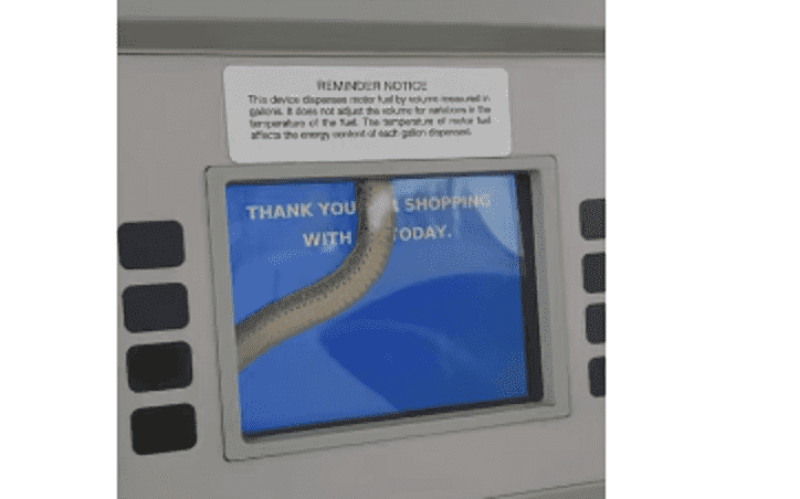 صُعقت امرأة وهي تقف أمام الشاشة الرقمية الزجاجية لمضخة وقود؛ إذ كان ثعبان ينزلق خلف الزجاج، وقد كُتب على الشاشة "شكرًا للتسوق معنا اليوم".
