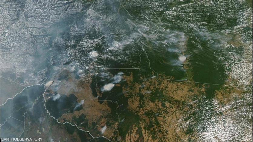 ونشر مرصد وكالة الفضاء الأميركية "ناسا" الأرضي، صورا على موقعه الإلكتروني تظهر غطاء من الدخان يغطي مساحات شاسعة من الغابات الواقعة في أميركا الجنوبية.