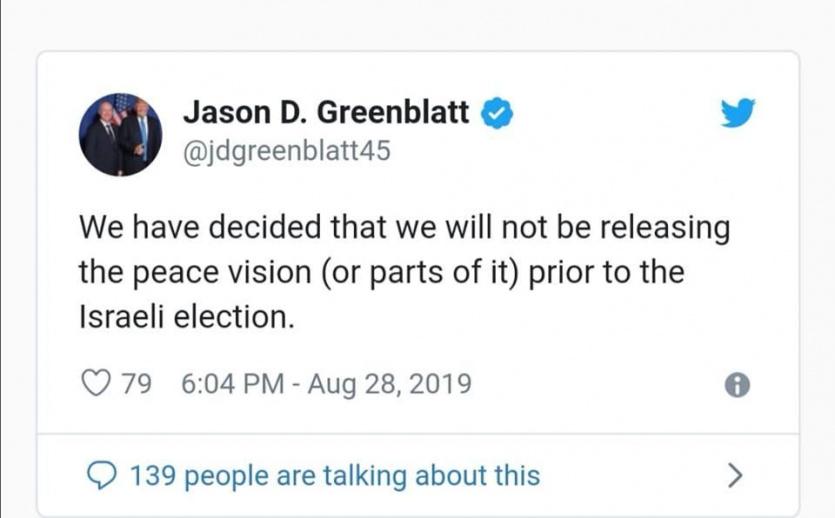 أعلن المبعوث الأمريكي للشرق الأوسط جيسون جرينبلات أن إدارة ترمب لن تنشر الشق السياسي من "صفقة القرن" إلا بعد الانتخابات الإسرائيلية.