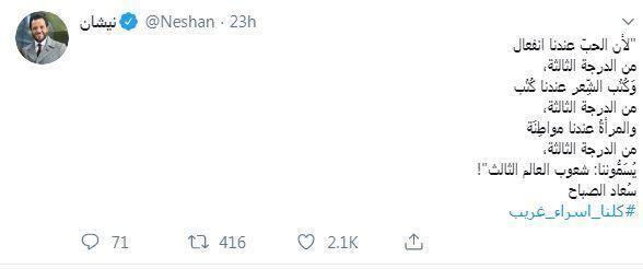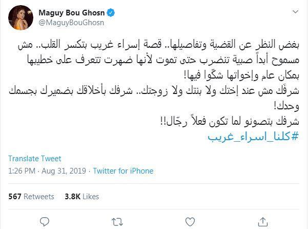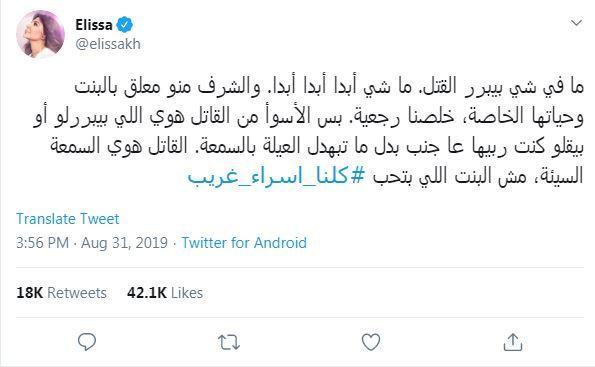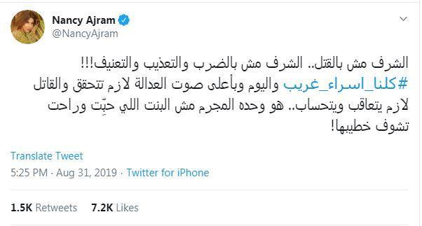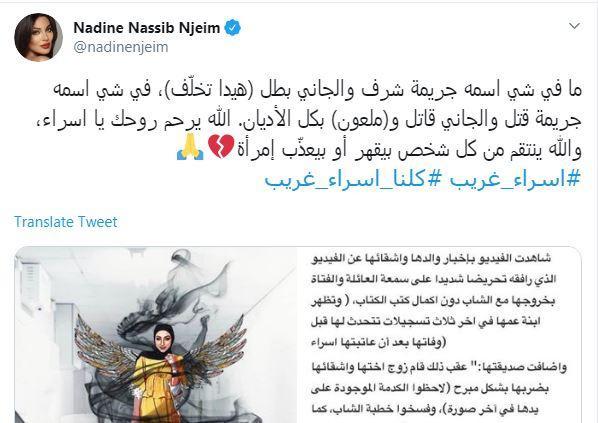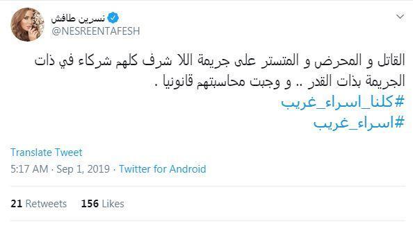 وغردت كل من الفنانات، نانسي عجرم واليسا وماغي بوغصن وندين نجيم، وغيرهن الكثير من الفنانات والاعلاميات على القضية تحت هاشتاغ "كلنا اسراء غريب".