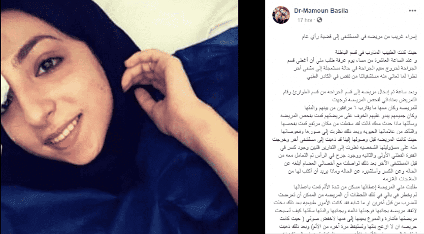 ويشاء الله قبل اسبوع أن أكون على دوام الطوارئ وتأتي مريضه متوافاه مع أهلها ملفوفه في شرشف وأدخلت غرفه صغيرة بالطوارئ لم أتوقع أن المتوفاه صغيره في العمر عندما كشفت عن وجهها تفاجئت بأنها جثة شابة سألت أهلها ما الذي حصل معها فقالو لي يوجد عندها كسر بالعامود الفقري منذ ثلاث اسابيع وهي مقعده على السرير واليوم ماتت منذ ساعه، ومن خلال النقاش توصلت أن المريضه لا تأخذ مميع للدم وهناك الكثير من المرضى من يموتون بجلطات رئويه حاده بسبب عدم اخذ المميع وتوقعت أن هذا سبب وفاتها طلبت من الأهل تسجيل المتوفاه وبعد التسجيل أكتشفت أنها نفس المريضة التي أدخلتها يوم وقفت عرفه ( إسراء غريب) في هذه الحالات عندما يأتينا متوفي من خارج المستشفى نطلب الطب الشرعي لمعرفة سبب الوفاة وخصوصا إذا كان المتوفى صغيرا في العمر طلبت من الشرطه طلب الطبيب الشرعي وهنا انتهى تعاملي مع الحالة.