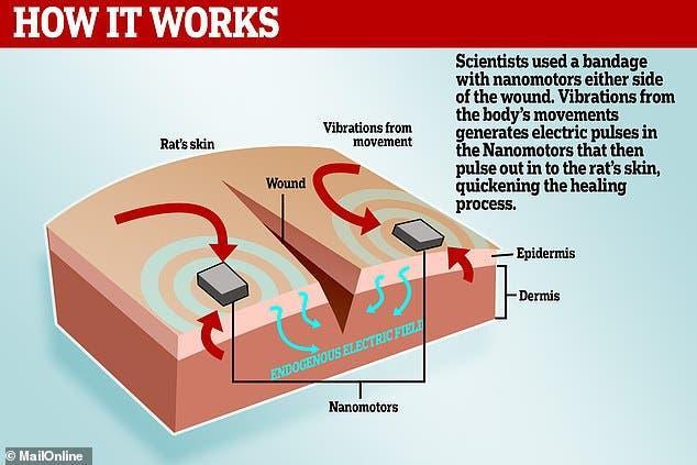 وأشاروا إلى أنه تم لفّ الضمادات المبتكرة حول أجسام الفئران التي يوجد جرح في ظهر كل منها، وأنه في كل مرة كانت تتنفس فيها القوارض، كان يتم توليد نبض كهربائي بسيط، تبين أنه يساعد في تسريع عملية الشفاء.