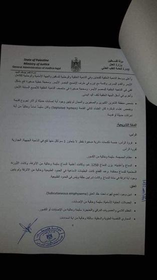 وجاء في التقرير أن إسرء توفيت نتيجة "قصور حاد بالجهاز التنفسي والانسجة تحت الجلد في الصدر نتيجة لمضاعفات الإصابات المتعددة التي تعرضت لها".