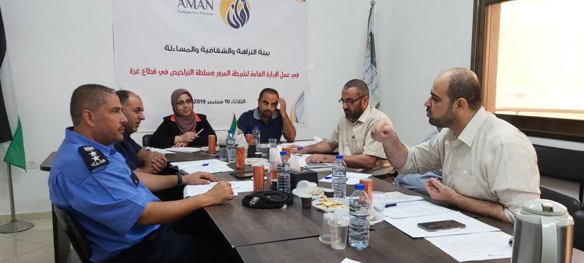 عقد الائتلاف من أجل النزاهة والمساءلة – أمان جلسة نقاش لتقرير " بيئة النزاهة والشفافية والمساءلة في عمل الإدارة العامة لشرطة المرور وسلطة التراخيص في قطاع غزة"، حيث خرج التقرير بمجموعة من التوصيات المتعلّقة بالإطار القانوني والمؤسسي تمثلت بمطالبة كل من وزارة المواصلات في الضفة الغربية وقطاع غزة بتوحيد الإطار القانوني الناظم لعمل سلطة التراخيص، بما فيها التعديلات الواردة على اللائحة التنفيذية لقانون المرور في الضفة الغربية، ومطالبة وزارة النقل والمواصلات في قطاع غزة بالتقيّد بالرسوم المفروضة على تراخيص المركبات والسائقين ومدارس تعليم السياقة حسب القانون، واحترام القواعد الدستورية التي تنص على عدم فرض أو تعديل الرسوم إلا عبر تشريع قوانين، إضافة الى إصدار وزارة النقل والمواصلات تعليمات وزارية بوضع مدونة السلوك الوظيفي التي أعدها ديوان الموظفين العام في قطاع غزة عام 2016 موضع الرقابة على إعمالها، إلى جانب مطالبة وزارة النقل والمواصلات بتفعيل المجلس الأعلى للمرور، وإعادة هيكلته على نحو يضمن تمثيل المجتمع المدني فيه.