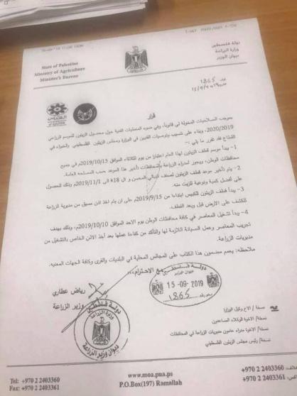 وفيما يتعلق بموعد القطف لهذا العام، قال عبيد في مقابلة مع راية إنه" جرى تحديد منتصف شهر تشرين أول القادم، ليكون موعداً لبدء القطف خصوصاً في مناطق شمال الضفة مثل جنين وقلقيلية وطولكرم ونابلس، اما المناطق الجنوب فسيكون النضج فيها متأخر أكثر نتيجة برودة الأجواء وأن الصنف المزروع هناك أغلبه من النبالي المحسن والذي يتأخر عادة في النضج، وبالتالي يبدأ القطف هناك في بداية شهر 11".
