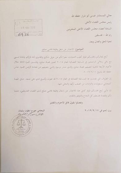 قدم المحامي جورج سلمان اعتذاره عن شغل وظيفة قاضي صلح لدى الجهاز القضائي الفلسطيني وذلك في كتاب بعث به لرئيس مجلس القضاء الأعلى عيسى أبو شرار.