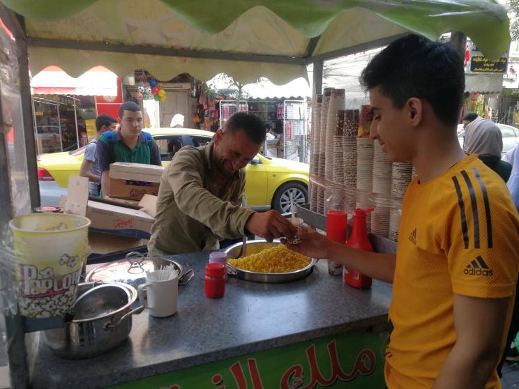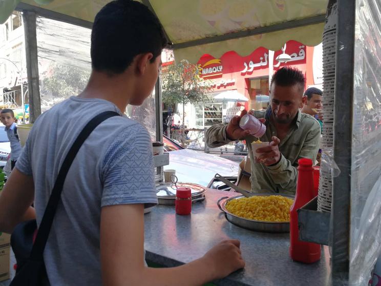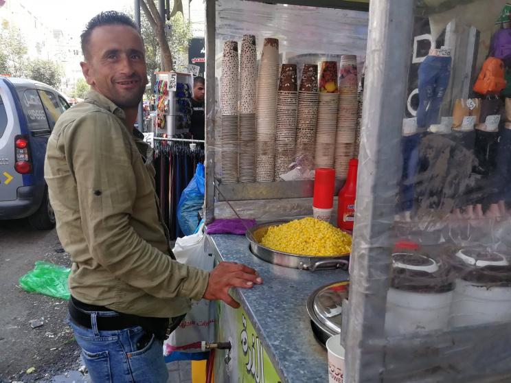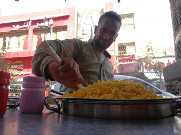 يوميًا؛ يدفع تامر عربة الذرة خاصته ذات العجلات الثلاث، العربة التي تشبه بتصميمها كوخًا صغيرًا، مغلقة من إتجاهين إثنين، يوضع على أحدهما الكاسات الكرتونية بأحجامها المختلفة، بينما يضع الملح والبهارات المختلفة على الإتجاه الثاني.