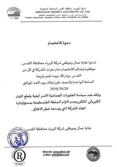 نقابة عمال "شركة كهرباء القدس" تدعوا موظفيها للإعتصام إحتجاجاً على العقوبات الجماعية