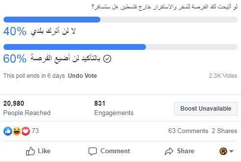 وشملت عينة التصويت 2200 مصوت، 60% منهم أجابوا بأنهم لن يضيعوا فرصة السفر والاستقرار خارج البلاد، فيما صوت 40% بأنهم لن يتركوا بلدهم.