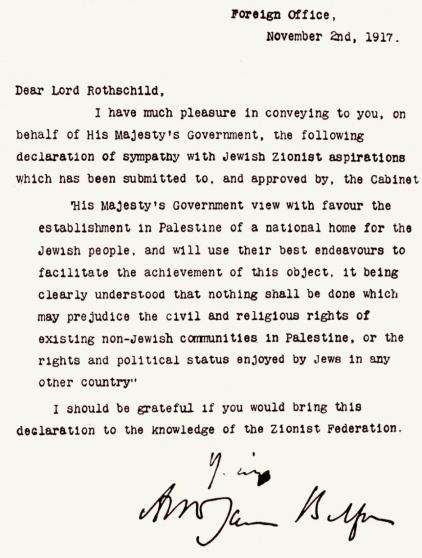 'إن حكومة صاحب الجلالة تنظر بعين العطف إلى تأسيس وطن قومي للشعب اليهودي في فلسطين، وستبذل غاية جهدها لتسهيل تحقيق هذه الغاية، على أن يكون مفهوما بشكل واضح أنه لن يؤتى بعمل من شأنه أن ينتقص الحقوق المدنية والدينية التي تتمتع بها الطوائف غير اليهودية المقيمة الآن في فلسطين، ولا الحقوق أو الوضع السياسي الذي يتمتع به اليهود في البلدان الأخرى'.
