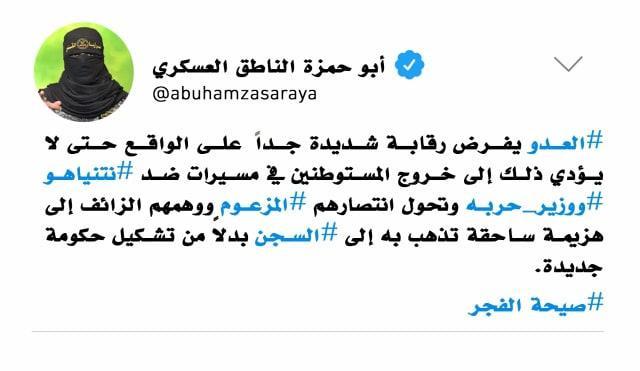 وأضاف في تغريدة له على تويتر:" وصلنا باستهدافاتنا إلى قلب الكيان والتي لو أفصح عنها العدو ستحول نتنياهو إلى أضحوكة ومهزلة في الشارع الصهيوني".