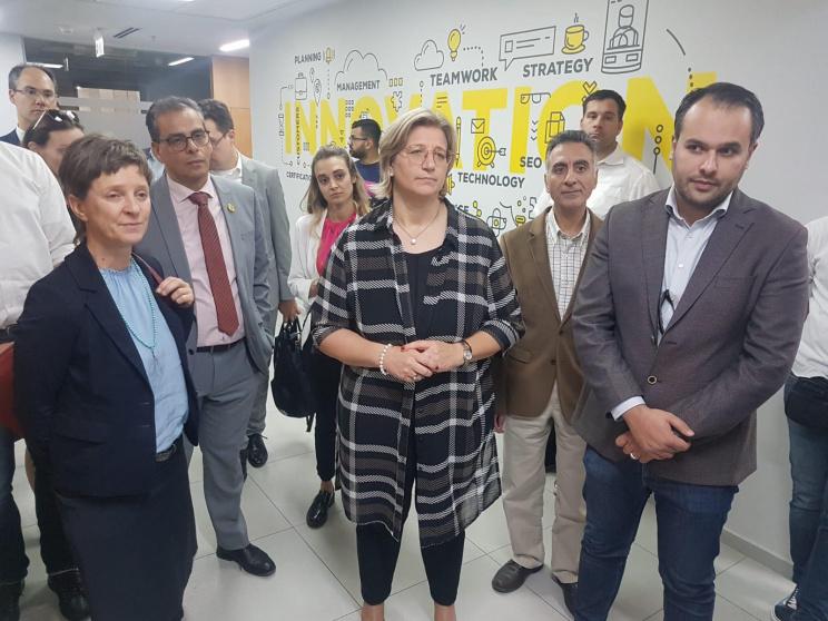 تفقدت نائب رئيس وزراء ولاية سارلاند الألمانية انكه ريلنجه، التي تشغل أيضاً منصب وزير الاقتصاد والعمل والطاقة في الولاية، طلبة برنامج الدراسات الثنائية في جامعة القدس المتدربين في شركات التكنولوجيا في مدينة روابي، برفقة وفد من إدارة الجامعة، ضمن جولة للاطلاع الميداني على عمل البرنامج المدعوم من الحكومة الألمانية، والوقوف على سير الشراكة بين الحكومة الألمانية والجامعة وشركات القطاع الخاص الفلسطيني، وسبل تطويرها وتعزيزها.