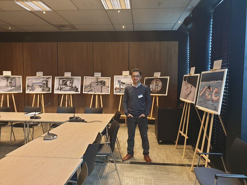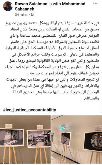 وعلق سباعنة على صفحته في فيسبوك على حدث الاختفاء بالقول: " سرقه معرض رسوماتي داخل محكمة الجنايات الدولية".