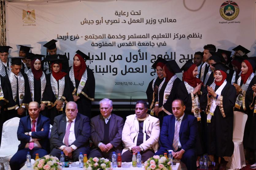 خرجت جامعة القدس المفتوحة ووزارة العمل، يوم الثلاثاء الموافق 10/12/2019م، الفوج الأول من الدبلوم المهني "فوج العمل والبناء"، منتخصصي اللغة العبرية، وتكنولوجيا الإنتاج النباتي، وذلك في احتفال أقيم في المسرح البلدي بأريحا بحضور محافظ أريحا والأغوار السيدجهاد أبو العسل، ووزير العمل د. نصري أبو جيش، ورئيس الجامعة أ. د. يونس عمرو، ورئيس بلدية أريحا أ. سالم غروف.