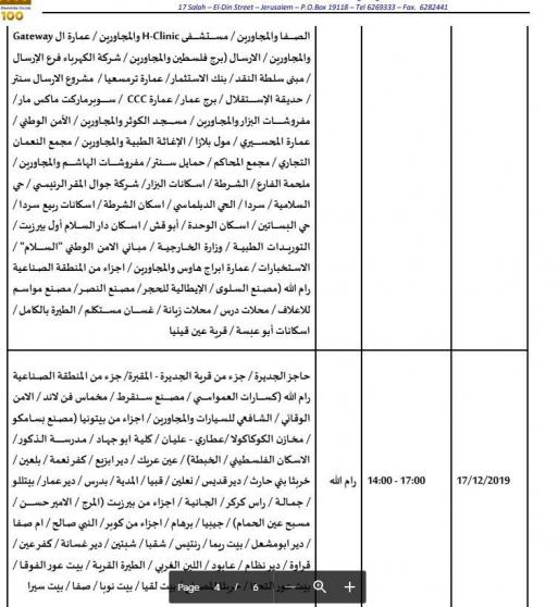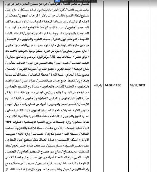 أعلنت شركة كهرباء القدس عن جدول الجولة الجديدة من قطع التيار الكهربائي والذي تسلمته الشركة يوم الأحد بتاريخ 8/12/2019 من كهرباء الاحتلال، تبعاً لجدول تقنين التيار الكهربائي عن مناطق امتياز الشركة التي بدأت في الجولة الأولى 22/9/2019 وحتى تاريخه، وهي بذلك تضرب بعرض الحائط كافة الاتفاقيات الموقعة بين الجانب الفلسطيني والإسرائيلي، وفقا لبيان كهرباءالقدس.