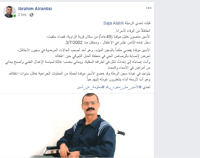 اطلق مغردون على مواقع التواصل الاجتماعي حملة تضامن مع الاسرى في سجون الاحتلال على شكل تحدي يتناقلونه بين بعضهم، حيث يذكر المدون معلومات عن اسير فلسطيني على صفحته الشخصية وينقل التحدي إلى أصدقائه المدونين.