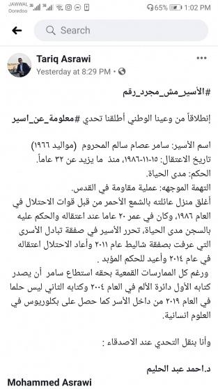 وأضاف:" هذا النشر وهذا التحدي الذي أطلقناه لن نكتفي به على مواقع التواصل الاجتماعي فقط، بل سنننقل الحملة إلى أرض الواقع من خلال الجامعات الفلسطينية عن طريق مسابقات توعوية لها علاقة بالاسرى، والجوائز ستكون عبارة عن كتب من أدب السجون التي تم تحريرها وكتابتها داخل السجون لكن اصحابها ما زالوا معتقلين".