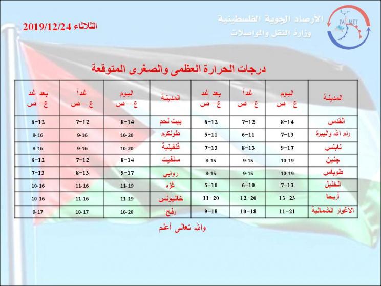 أفادت الأرصاد الجوية الفلسطينية أن الليلة سيكون الجو غائما جزئيا بوجه عام وبارداً وأمطار فوق بعض المناطق الشمالية ، والرياح جنوبية غربية معتدلة الى نشطة السرعة مع هبات قوية احيانا والبحر متوسط ارتفاع الموج الى مائج .