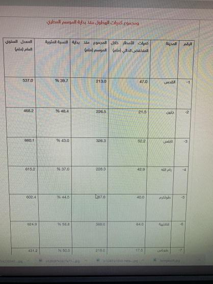 قالت دائرة الأرصاد الجوية في وزارة النقل والمواصلات إن محافظة قلقيلية سجلت أعلى كميات هطول مطري منذ بداية الموسم حتى تاريخه، حيث وصلت إلى 368 ملم، وهذا شكل ما نسبته 59% من معدلها السنوي العام، تلتها مدينة نابلس، حيث بلغت أمطارها 326، وشكلت 49% من معدلها العام.
