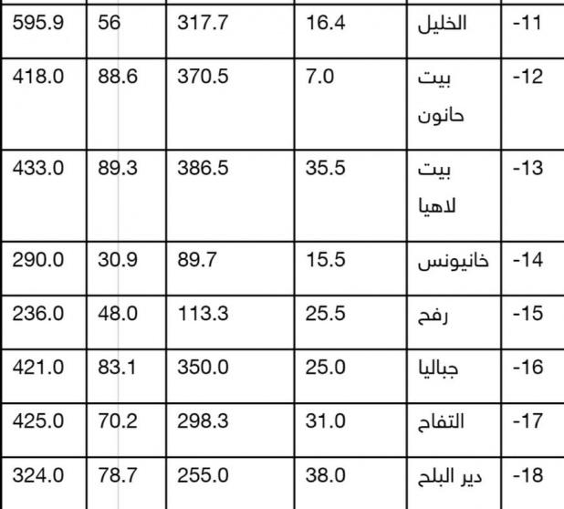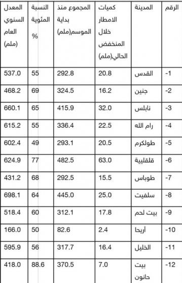 وأظهرت دائرة الأرصاد أن مدينة قلقيلية من أكثر المدن التي هطلت فيها الأمطار، وبلغت الكمية 482 ملم بمعدل 77%، اما في مدينة سلفيت بلغت 445 ملم بمعدل 64 % بينما بلغت ادناها في مدينة أريحا 83 ملم بمعدل 50 %.
