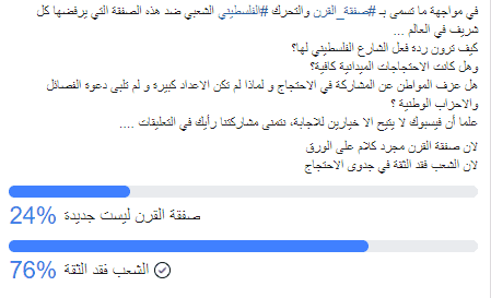 ووفقاً للاستطلاع، فإن 76 % من المشاركين رأوا ان ضعف المشاركة يعود الى فقدان الثقة في جدوى الاحتجاج بينما رأى 24% ان بنود صفقة القرن ليست جديدة وهي مجرد كلام على الورق وعليه كانت المشاركة ضعيفة في الفعاليات الوطنية.