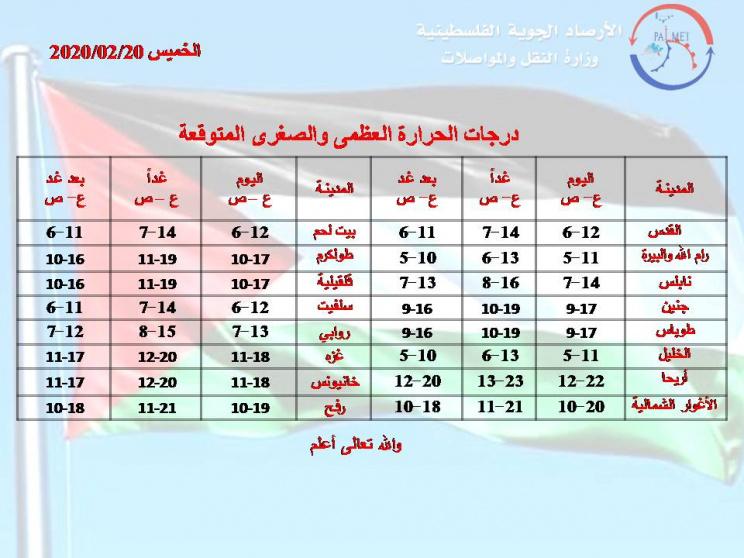 الخميس: يكون الجو غائماً جزئياُ الى غائم ولا يطرأ تغير يذكر على درجات الحرارة ويكون الجو باردا الى شديد البرودة وتكون الفرصة مهيأة لسقوط أمطار متفرقة على معظم المناطق ،والرياح غربية الى شمالية غربية معتدلة الى نشطة السرعة والبحر متوسط ارتفاع الموج .