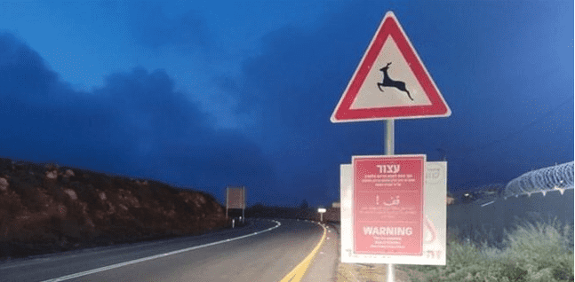 وتقول اللافتة باللون الاحمر وباللغتين العربية والعبرية "توقف! انت تدخل منطقة الدولة الفلسطينية ..هذا المنطقة هي جزء من الدولة الفلسطينية المستقبلية وفقا لصفقة القرن".